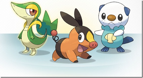 The three new starter Pokémon have been given their localized names, too. From left to right, they’re called Snivy, Tepig and Oshawott.