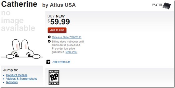 Furthermore, Gamestop had a listing for Catherine on their website a while ago, too, that was subsequently taken down. However, the page still exists in cached form and also lists the game’s release date as July 26th. Whoops!