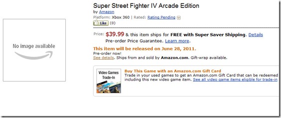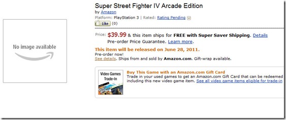 Amazon list Super Street Fighter IV Arcade Edition at $40, slated for release on June 28th for the Xbox 360 and PlayStation 3: