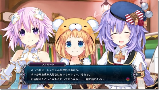 - Plutia (CV: Kana Hanazawa), Peashy (CV: Aoi Yuki): The two work together at an accessory shop in Four Goddesses Online. If you purchase any accessories sold from Plutia and Peashy’s store, it’ll change your character’s appearances. All party members can equip accessories, and you can even purchase some series recurring costumes.