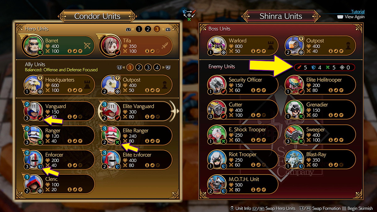So whenever you are about to start a Fort Condor Skirmish, check the Shinra Units side of the menu and take a total of which pieces they are bringing into battle. A good rule of thumb is to try to have more units than two of the elements on their team. For example, have more Bow and Sword characters, etc.