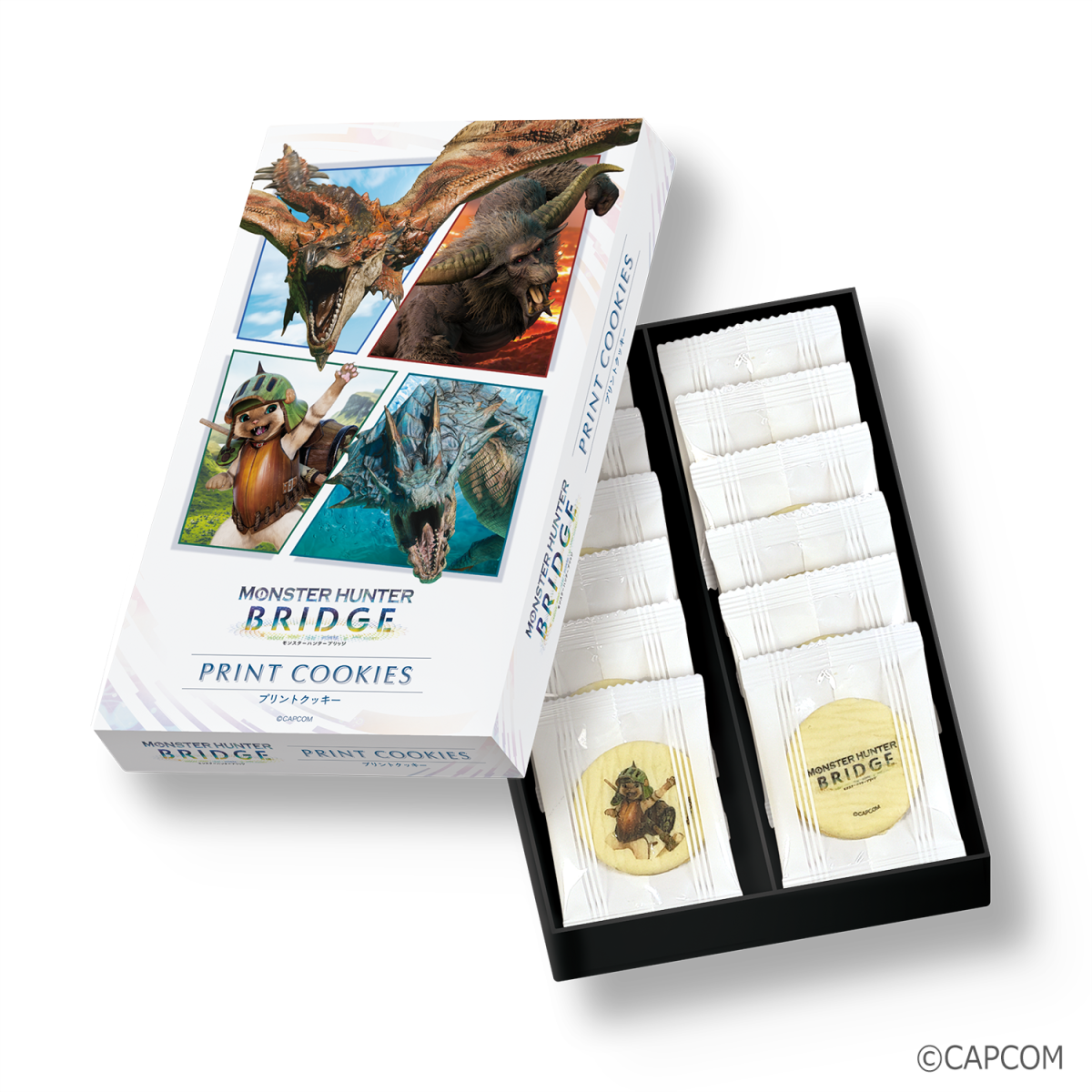 In addition, Capcom will sell a couple of Monster Hunter-themed snacks at the Expo. The first one will be a pair of cans containing Gaufre-fre waffles, the name of which includes a play on Khezu’s Japanese name Furufuru, priced at 1,620 yen (~$10.80). The other set costing 2,516 yen (~$16.80) will contain cookies printed with artwork and logo from Monster Hunter Bridge, the Augmented Reality attraction that will run inside Osaka Healthcare Pavilion’s XD Hall.