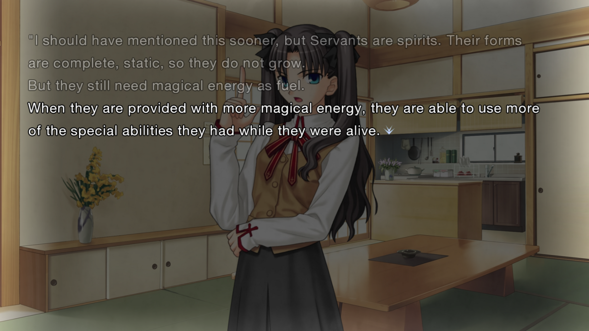 I played the game after the issues with the English version were patched out. So I didn’t get the authentic experience of playing a Japanese visual novel. Though I did run into some performance issues, I’m pretty sure they’re avoidable if you don’t do what I did (thus it won’t affect the score). For one thing, playing the game on a second monitor doesn’t work in fullscreen. It keeps minimizing. I played Ace Attorney Investigations on a second monitor in fullscreen and it ran fine, so this is unique to Fate/stay night. Even windowed, issues cropped up. Letters would be missing or entire lines would run into each other. I know this is a problem with the monitor rather than the game because if I took a screenshot or dragged the window to my main screen, it looked fine. Moral of the story? Fate doesn’t like playing second fiddle.