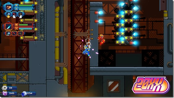 20XX lets two players tackle its randomized sidescrolling action, allowing players both online and off to fight against powerful machines and bosses using some familiar blasters, laser sabers, dashing, and wall-jumping powers in the game’s Mega Man X-like play.