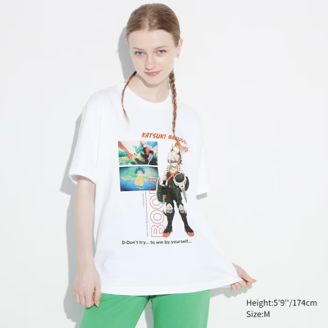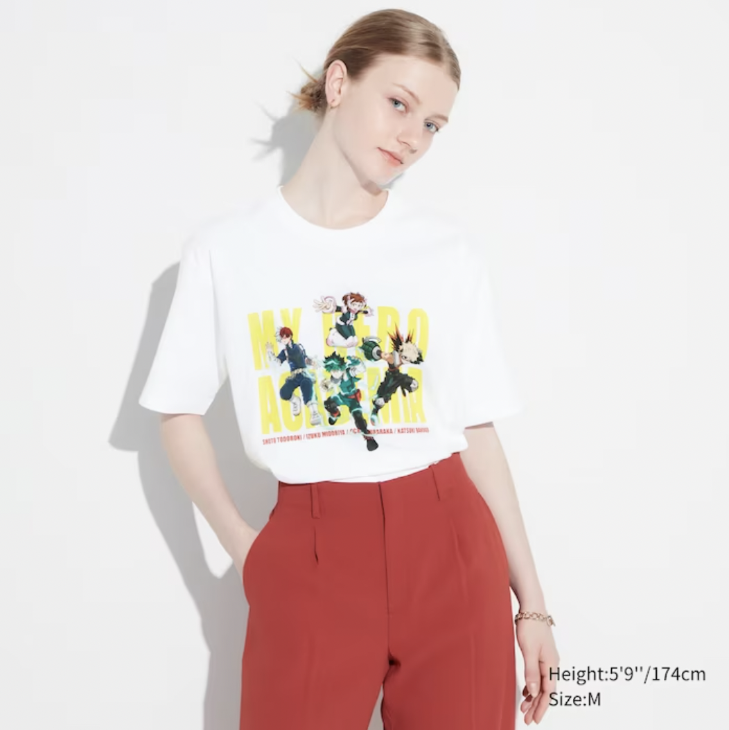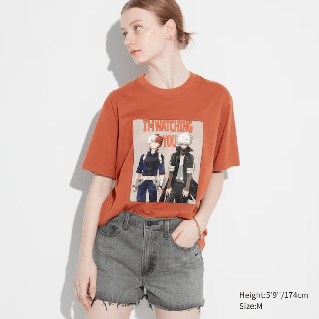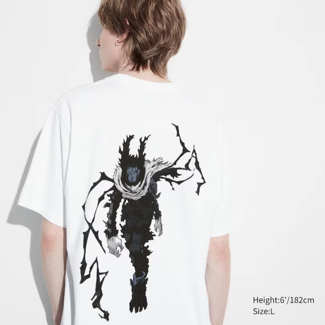 Back in June 2023, Uniqlo announced it would sell My Hero Academia shirts. Now all six options are available outside Japan. They are adult unisex style ones, ranging from sizes XXS to XXXL. They can be found online and in stores. The designs cover multiple characters from the series. One features Deku alone on the back. Another features villains like Tomura Shigaraki, Dabi, Himeko, Mr. Compress, Spinner, and Twice on the back of the shirt as well. There’s a design that has Himeko and Ochaco. Bakugo gets his own shirt with a design on the front. Another has Deku, Ochaco, Shoto, and Bakugo. Finally, there’s a shirt that’s sort of a spoiler with Shoto and Dabi. Here’s a closer look at every design on Uniqlo models. In the case of some, like the villains shirt, there is only an image on the back and nothing on the front.