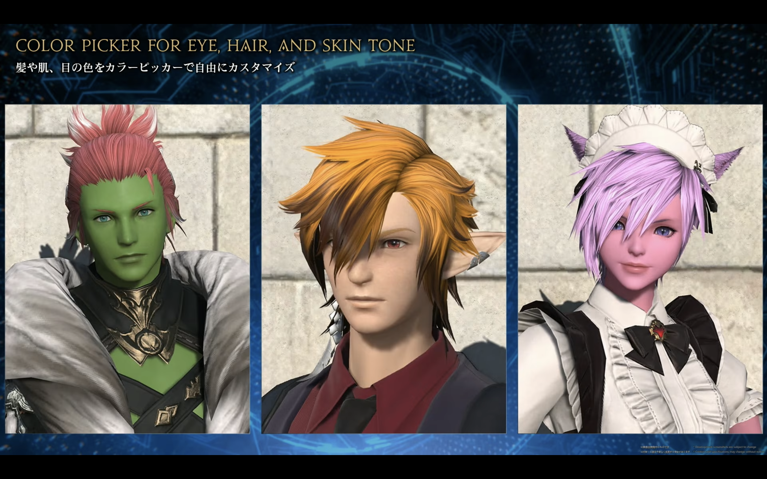 As for the FFXIV character creation options and additions coming in Evercold and 8.0, Naoki Yoshida mentioned more will be available as a result of things like the 7.0 graphics update. These will appear in 8.0, 8.1, 8.2, 8.3, and beyond. Yoshida joked there will be no butt sliders. However, when the expansion launches, we should see eye, hair, and skin tone color pickers, eye shadow, eye and lip customization, face paint layering, and toggling of certain parts of gear pieces. A number of slides showed the new customization options that will appear as a result of that.
