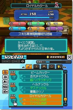 Each piece of equipment — weapon, body armor, head armor, accessory — has a grade as well as a maximum stat. An item with D-rank not only has a lower base stat than one of B-rank, but also a much lower potential for stat increases. If you max out the stat through upgrading, the only way to continue upgrading that item is to increase its rank by combining it with a special item. For example, if I max out a rank D Jibral Sword, the only way I can make it stronger while keeping it a Jibral Sword is to combine it with a C-rank Apple. This way, I’d get a rank C Jibral Sword. This way, you can continue using the equipment you’ve had from the beginning of the game should you so choose.