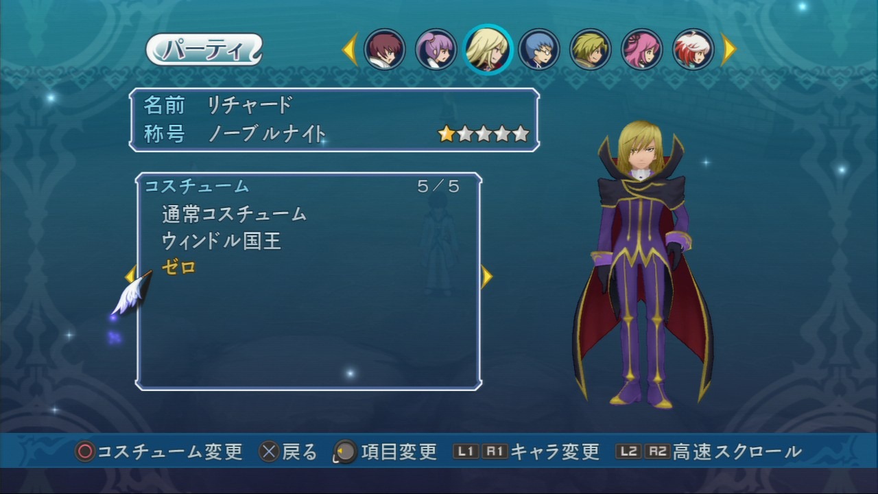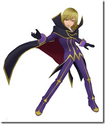 For an additional fee, players can dress Asbel Lhant from Tales of Graces F up as Suzaku Kururugi. Namco Bandai plans on selling Code Geass costumes for Cheria (Kallen), Sophie (C.C.), and Richard (Zero). Each costume comes with a title and various status boosts.