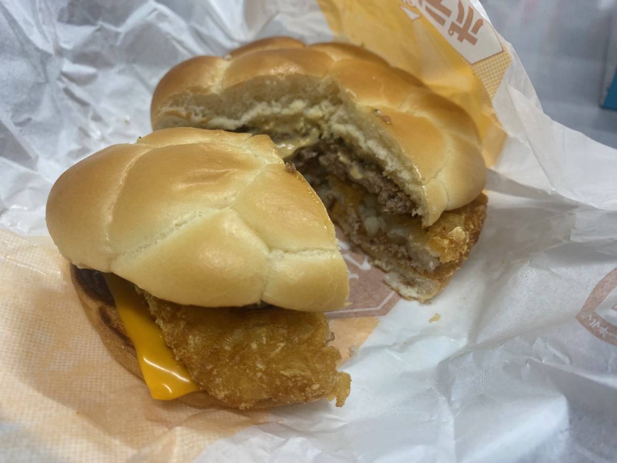 A real gap between the McDonald’s Evangelion crossover marketing photo and the reality for this one, but we all know how that goes. The Hashbrown & Beef Burger with Garlic Mayo comes off as the busiest of this bunch. You’ve got the same fancy bun we saw with the Mexican Cheese Chicken Burger, with a thicker-than-usual beef patty. From the bottom to the top, you get some tangy steak sauce, a slice of processed cheese, a hashbrown potato patty, the aforementioned beef patty, and some garlic mayonnaise sauce. Surprisingly, this is not the highest-calorie sandwich of the three. That would be the next one.