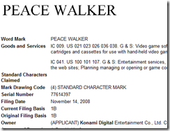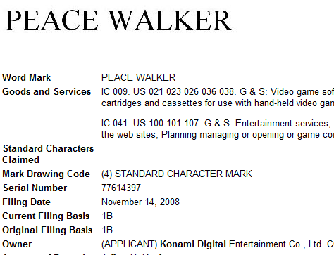The USPTO dropped a hint of something else Konami is working on, but I can’t figure out what it’s related to. Last week the publisher registered Peace Walker for use with video games and more notable online video games too. Most of Konami’s other video game trademarks like the one we discovered for Suikoden Tierkreis are just filed for use with video games and computer software.