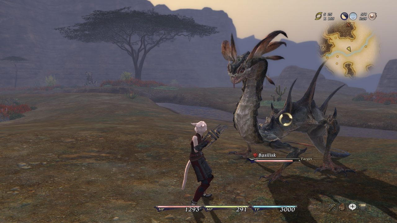 Aetheryte crystals in town restore your character and trigger guildleves (read: quests). I picked a monster hunting guildleve in Gridania and hunted shriekshrooms. As soon I triggered the guildleve the map pointed out the monsters so I didn’t have to waste any time finding my prey. I had 30 minutes to complete the quest, but I didn’t need that much. Including walking, it took about seven minutes to complete. Maybe the guildleve was too easy? In Ul’dah I set a mole hunting quest to the toughest difficult level. Now enemies were a real threat, but even solo I still managed to complete it… after a few deaths, of course. I didn’t make it far enough in the game to fight cool looking monsters like the Basilisk pictured above.