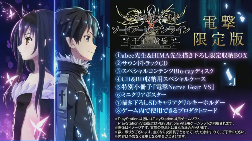 2016-12-07_051401 Bandai Namco shared the latest on their upcoming Reki Kawahara crossover game, Accel World vs. Sword Art Online during a Dengeki live stream today. Here’s some new info we got from the event.   2016-12-07_051515 While the game is called Accel World vs. Sword Art Online, characters from both series will go up against each other, but they’ll also work together. The Sword Art Online characters specialize in aerial combat while the Accel World characters specialize in land combat. Other than Silver Crow, none of the Accel World characters are able to fly.   2016-12-07_051617 As previously detailed, the game is an action RPG that focuses on creating your dream Accel World x Sword Art Online party of three that you’ll switch between as part of the “GS Active Change Battle” system.   2016-12-07 05-27-40-287 Bandai Namco won’t have a limited edition version, but they’re leaving it to Dengeki, who will provide updates on their own exclusive limited edition version for the game. It features the following: