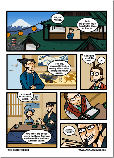 If you’re a fan of Ace Attorney, you’ve no doubt seen the above webcomic by Katie Tiedrich. It’s a fun little jab at how the Japanese Gyakuten Saiban games take place in Japan, but their localized Ace Attorney versions take place in Los Angeles. In a post on the Capcom Unity blog, Janet Hsu, who has been involved with the Ace Attorney localizations for years, explains the change. Below is Hsu’s explanation regarding the switch from Japan to Los Angeles, and her thinking behind it: