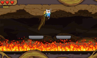 After I brought the Hot Dog Princess a treat, I walked on the overworld to one of the game’s dungeons. Just like Zelda II, dungeons are 2D areas with monsters. Well, animals with hammers and other tools the evil Ice King tied onto them. That jerk! The first dungeon also had moving platforms hovering over lava to jump on and gusts of wind that shot Finn up in the air. The same wind blasts blocked Finn and Jake from moving them forward by pushing them away. Hidden in this dungeon is a shield ear ability for Jake which stretches his ear into a giant shield that can block enemy attacks and most importantly the wind.