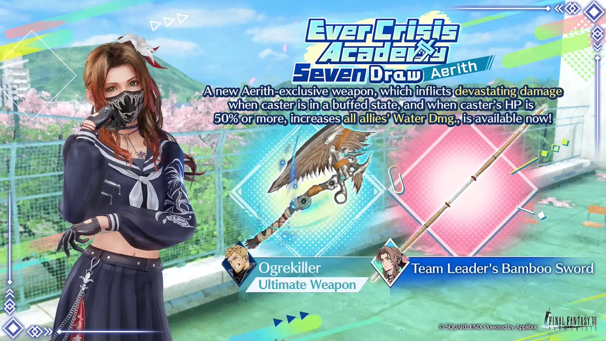 The latest FFVII Ever Crisis banner for the Ever Crisis Academy event that turns characters into high school students and teachers is live, and it involves Aerith getting a Bamboo Sword weapon and Seventh High Team Cetra Uniform gear costume. Both are five-star pieces of equipment. It is now live in-game until May 28, 2025, and once again the Glenn Ogrekiller Ultimate Weapon remains the other focus option on it.
