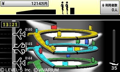 In Aero Porter, as previously detailed in our impressions, you control a luggage conveyer belt at an airport, and use it to direct luggage into planes. Bags and planes are colour-coded, and you need to use L and R to move luggage up and down, and send it into the plane of the appropriate colour.