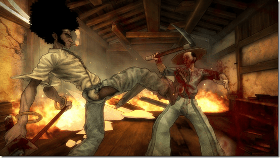 Well first of all, Afro is a samurai, so of course has he has various ways of attacking with his katana. In addition to the Slice mode, Afro can sometimes enter an Overfocus mode, where the screen goes black-and-white, everything slows down except for Afro, and he becomes god-like with the ability to cut through enemies like butter. Besides that, he incorporates some unconventional (for a samurai) ways of attacking such as kicking enemies or hitting them with his scabbard. His kick combos are beautifully brutal.