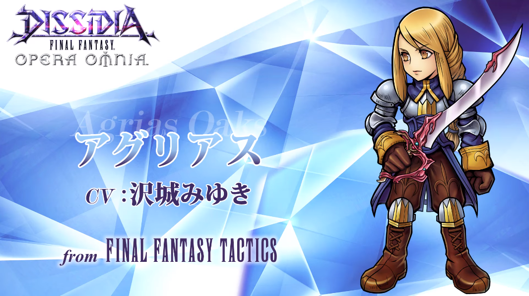 Agrias from Final Fantasy Tactics has been added to Dissidia Final Fantasy: Opera Omnia as a new event character. [Thanks, Dengeki Online!] In her original game, she served as a knight in the Lionsguard, who personally guard the royal family. Agrias guarded Princess Ovelia herself, and joins early on in the story. In Dissidia Final Fantasy: Opera Omnia, Agrias uses holy sword techniques that stop enemy actions in order to protect her allies. Here’s the trailer for Agrias: Dissidia Final Fantasy: Opera Omnia is available for Apple iOS and Android devices.