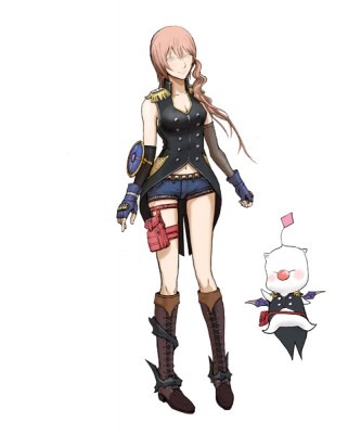Oshima calls this first outfit "exposure and defense." When designing this costume she wondered is it really possible for Final Fantasy female characters to fight with so much showing. Oshima thought adding pointed shoes and a shield would make Serah ready for a fight.