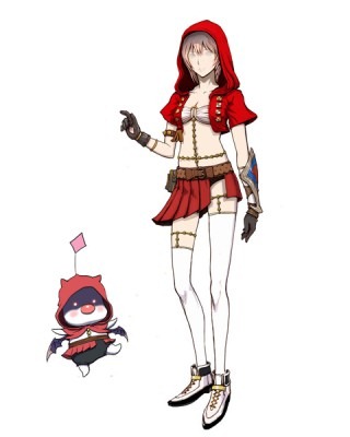 The second costume has a red riding hood motif. Oshima thought the idea of mixing red and white together defines a character transitioning into an adult.