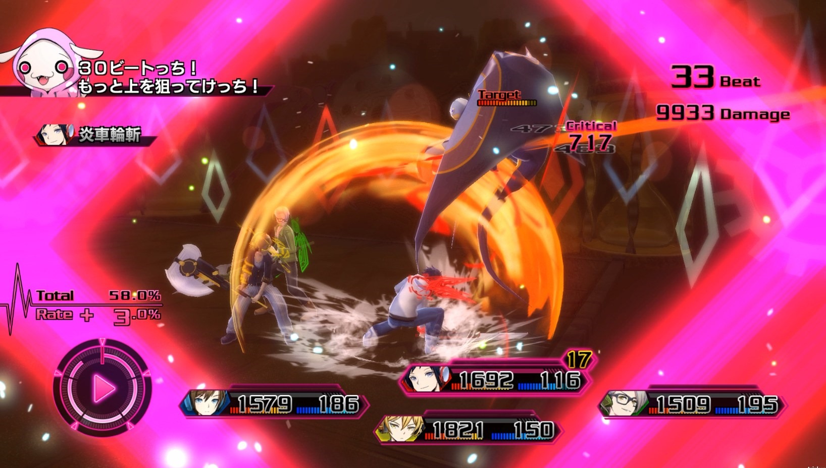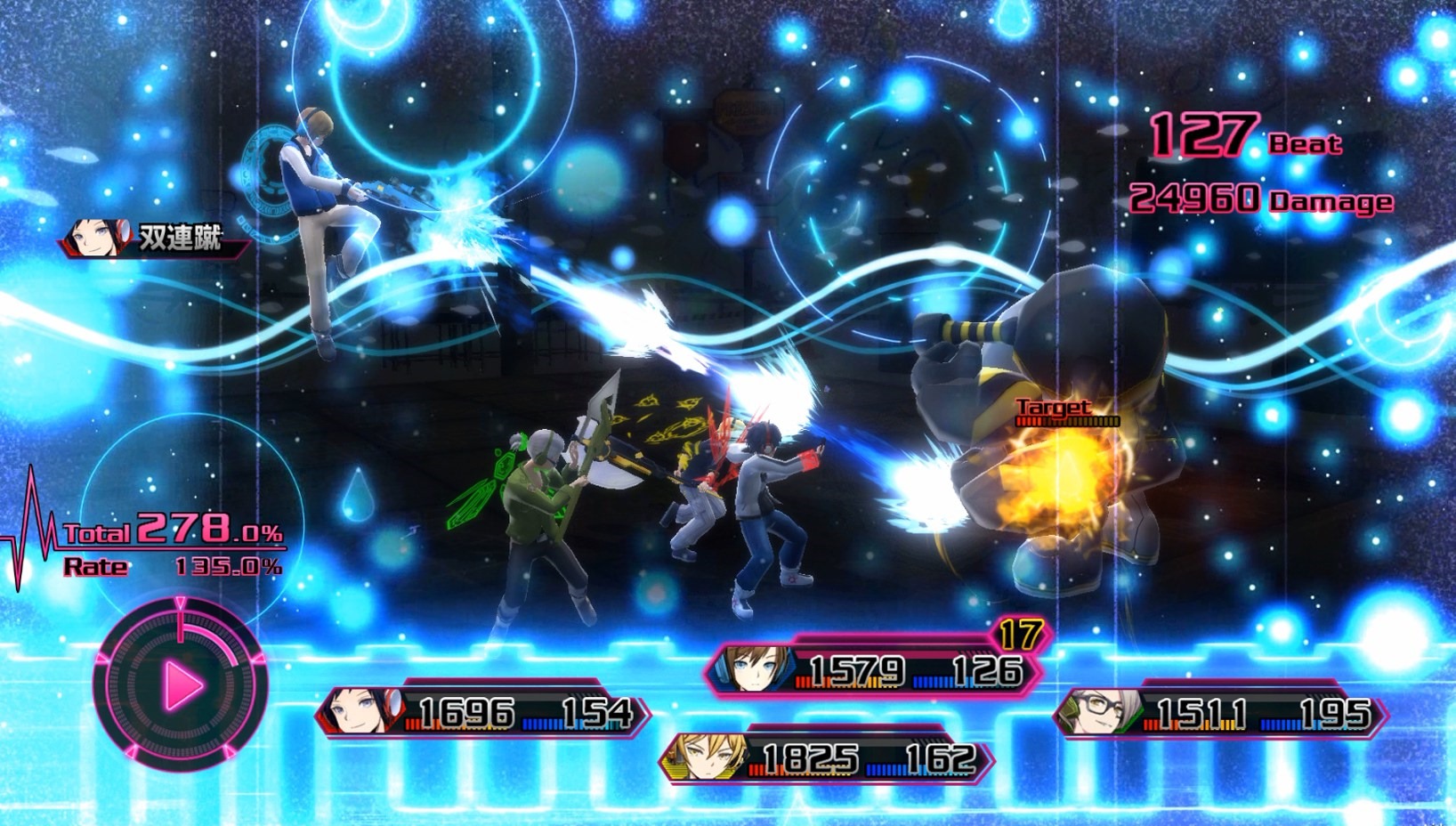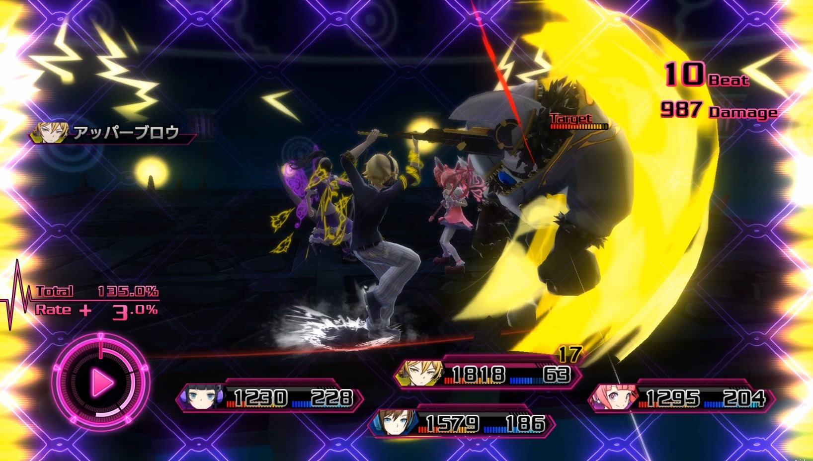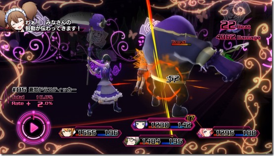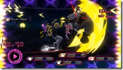 When you activate Imagine Mode with the Imagine Gauge filled up all the way, a headphone cut-in appears and the “Imagine Field” activates. While inside the Imagine Field, all members go into Imagine Mode. The Imagine Field creates flashy battles that feature a unique presentation for each song and character. Again, a new parameter marked as “Rate” and “Total” appear as well. Total shows the attack power while Rate shows the scale that goes into Total, to give you a better idea of how much damage you’ll be dealing to the enemies. While inside the Imagine Field, the Rate changes according to the upsurge of the music, and your fighting style affects the Total.