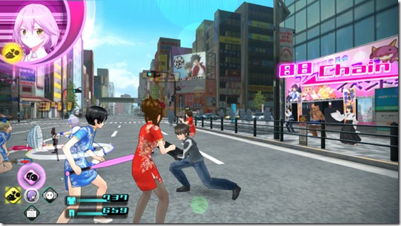 Before all is lost, you’re saved by a mysterious beautiful girl. Then, you return the favor and save the girl back, and end up dying in the process. No worries, though—she brings you back to life by forming a blood pact. It seems she is a Nighteater. Think of them as sort of deity-like protectors of the people who have been fading away over the past thousands of years, but a few still live on. Now you are half Synthister, half Nighteater Familiar, and all hero. You eventually meet up with your old friends at your favorite game bar and base of operations: MOGRA, and together as The Akiba Freedom Fighters, fight off the Synthisters, and take back the city. …by stripping them of their clothes, of course! After all, they’re weak to sunlight. Get them down to their skivvies, and the suckers fry. Again, you should know what you’re getting into here. Undead & Undressed is pretty much a fanservice game with mechanics centered on getting people’s clothes off. Gameplay is simple enough, and is done through three buttons, primarily. Triangle attacks the head, Circle the torso, and X the legs. If you do enough damage to one of those areas by holding down the button, you can strip the corresponding clothes off. Strip all three areas and the person is now naked. If you do it well enough, and stream combos you’re rewarded with flashy animations of you running around, and people being embarrassed. It’s silly, it’s total fanservice, and… it’s actually a lot of fun.