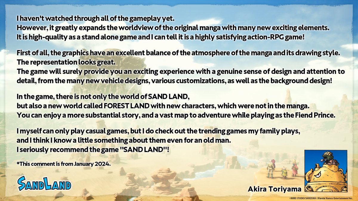 The announcement noted that Akira Toriyama shared this statement about the Sand Land game back in January 2024. The mangaka, who was known for Dragon Ball, Doctor Slump, and Dragon Quest series character designs, died back in March 2024. This comment offered his thoughts on the game based on footage he’d seen. He closed out the message by mentioning he could “only play casual games.”