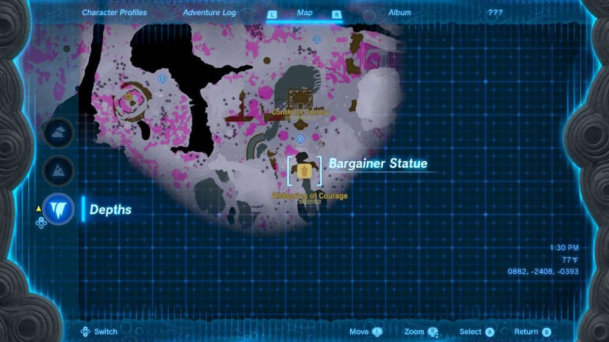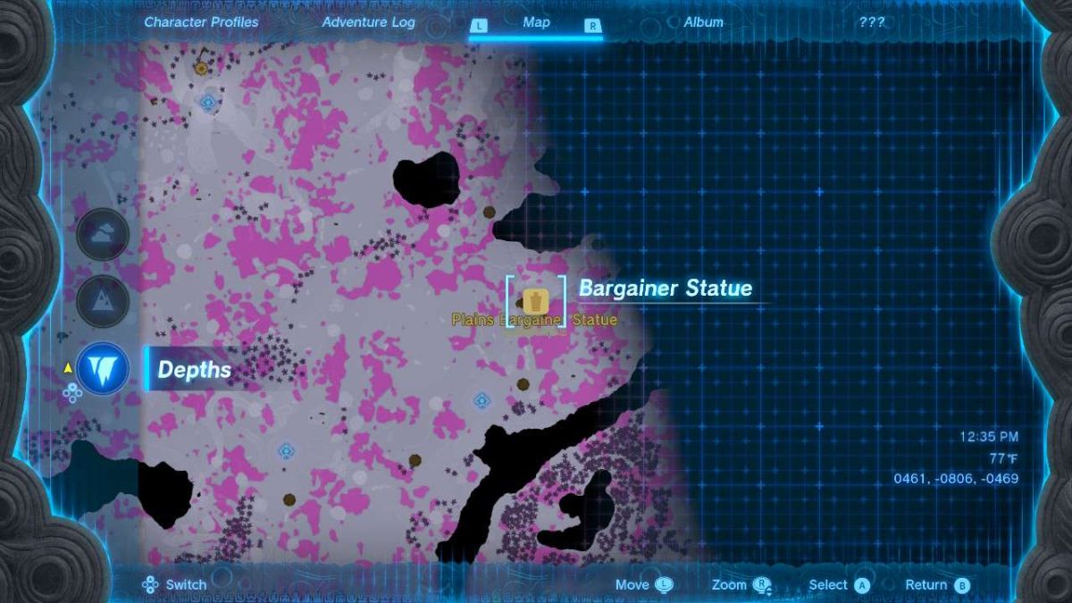 You’ll find the Plains Bargainer Statue in the Depths at map coordinates 0461, -0806, -0469. The easiest way to access it is to head northeast from the Stakijat Lightroot. If you haven’t unlocked it, glide down the Hyrule Field Chasm using your Paraglider and travel southeast.
