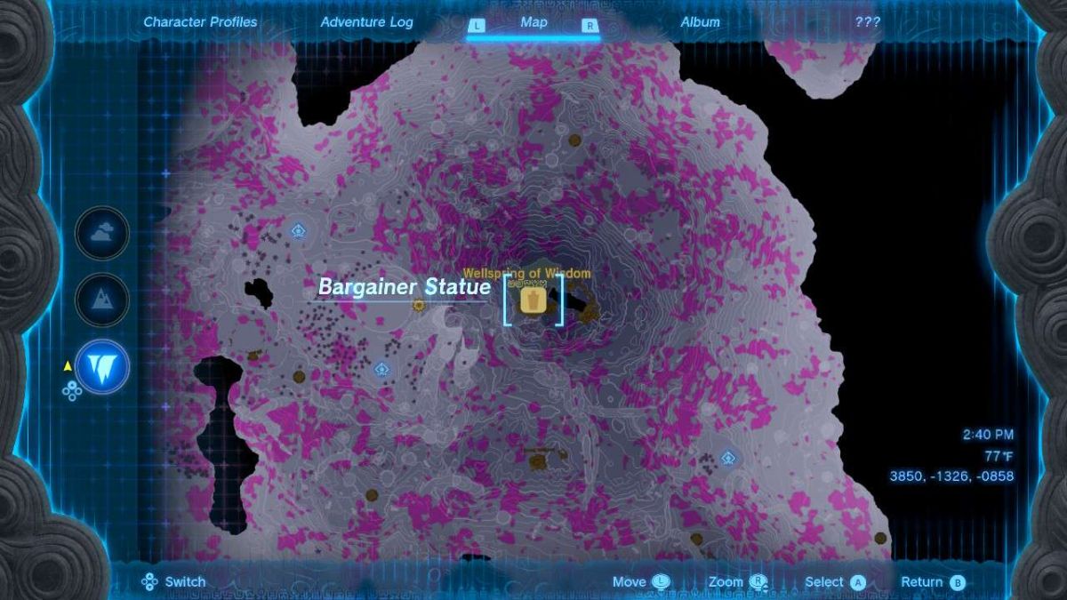Drop down the Naydra Snowfield Chasm on Mount Lanayru and head east to find the Wellspring of Wisdom Bargainer Statue at map coordinates 3850, -1320, -0858. If you’ve lit the Usukaz Lightroot, you can warp there and travel northeast.