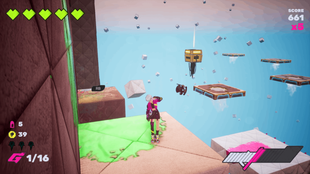 In this area, glide across to reach some steps behind the screen. This area is now aligned with the top of the spinning structure, which you need to carefully use to jump across to reach the ghost. This can be a frustrating set of jumps, but fortunately, a grind rail will appear, so you won’t need to do the timed platform run again if you need to try again.