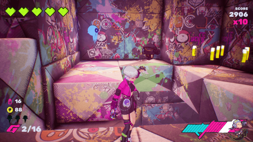 After a room full of enemies and a big screen, you can climb a hill and grapple across to a new area. Look to the right wall, and a set of crates hides a small gap you can slide under. There’s a glass sheet you can break here that leads to an area with enemies and a ghost on a platform.