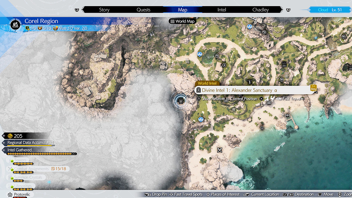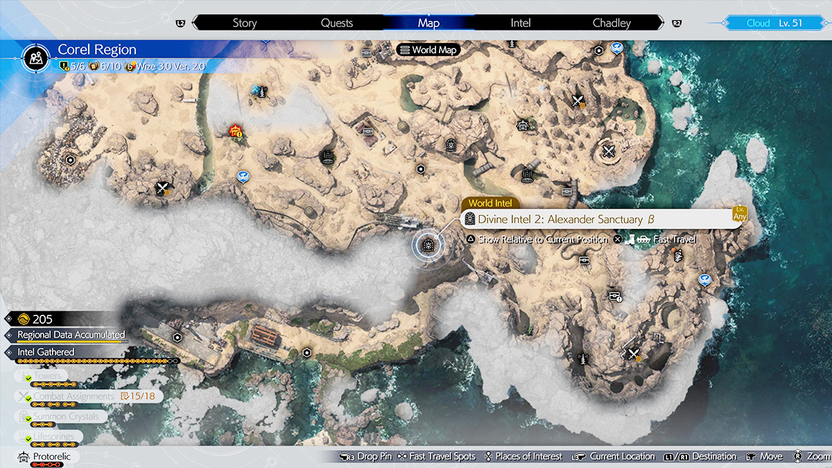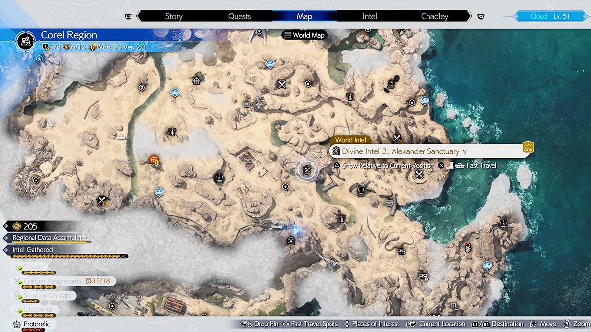 After finishing the Gold Saucer segment, you will obtain the Buggy vehicle, which unlocks the southern Corel desert region. With that out of the way, we have already mapped out where each Alexander Sanctuary can be found in the Chapter 6 region. Below is a map of all Corel Divine Intel in FF7 Rebirth: