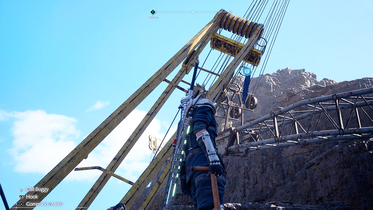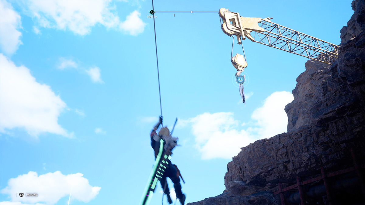 You will now want to swing Cloud back and forth on his rope to gain momentum. Tilt your camera up again and use the “L2” button to use your grappling hook on a second yellow construction pulley that is suspended in the air above you. If timed correctly, Cloud will now automatically jump to the next hook.
