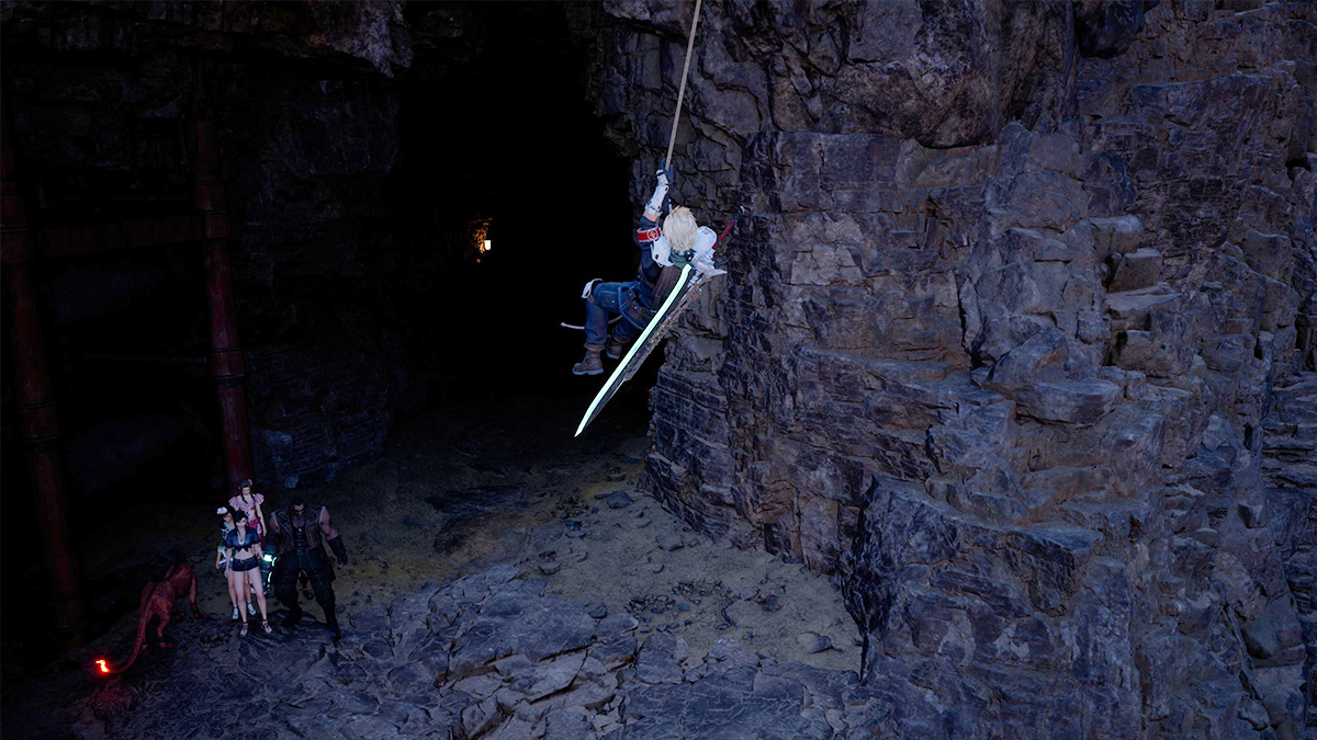 Finally, have Cloud swing to the plateau below him. You will know you are aiming at the right place as the “Circle” button will pop up. The platform also has a cave entrance in front of it. Once Cloud lands on the platform, run inside the cave to find Alexander Sanctuary β.