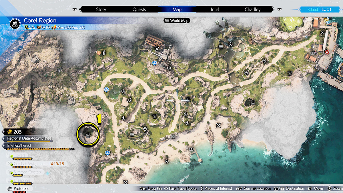 Unlike the Junon Divine Intel in FF7 Rebirth, Corel is actually broken up into two maps. After leaving Costa del Sol in Chapter 6, you gain access to the first open-world section of Corel which is in the northern map of the region. However, you need to complete Chapter 8: All That Glitters before you can actually access Corel Divine Intel 2 and 3.
