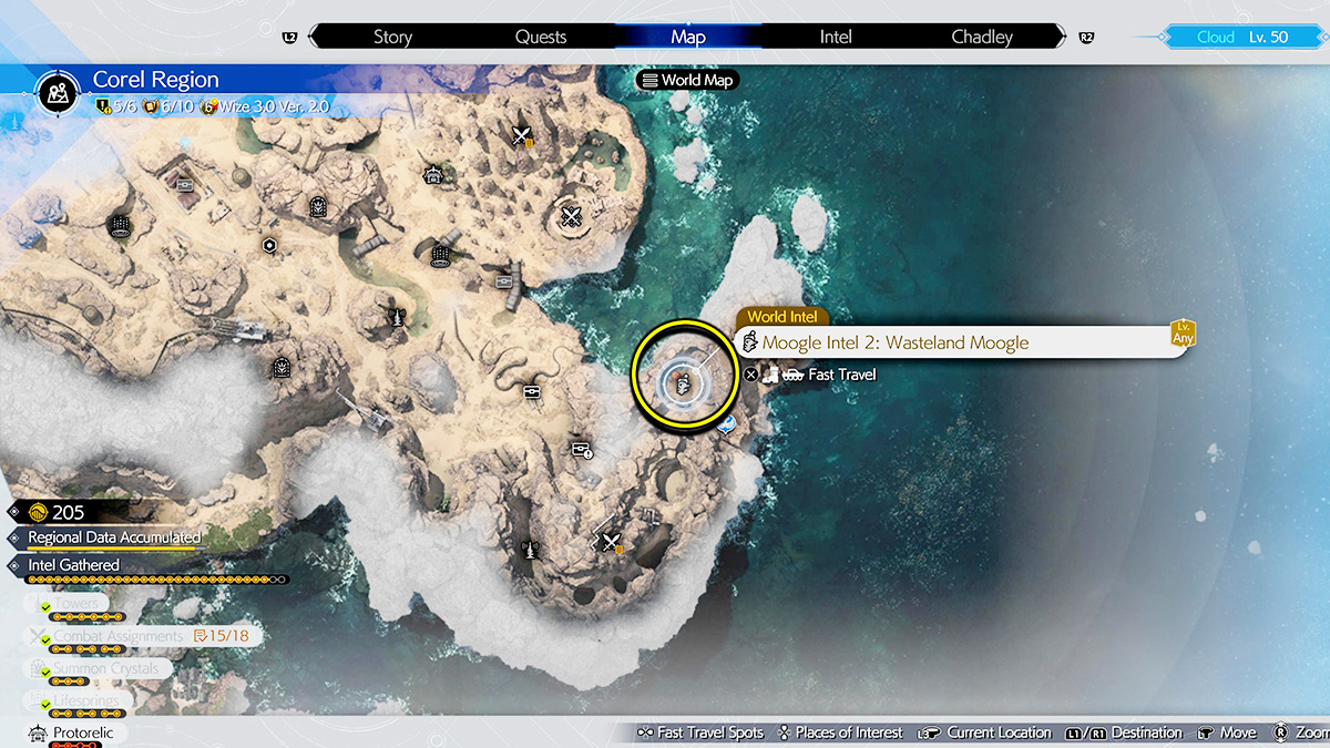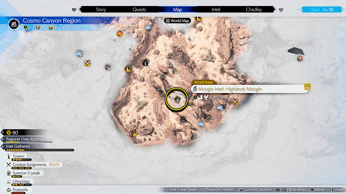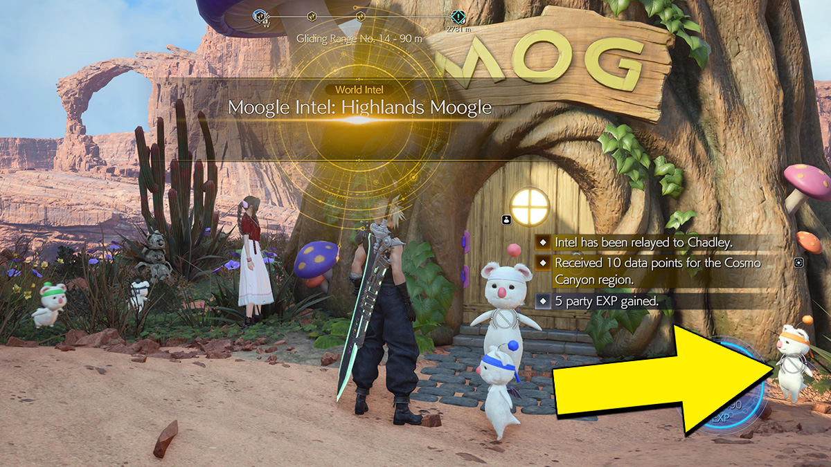 The most difficult Moogle Emporium to find is the one in Cosmo Canyon. To access it, you need to progress the story far enough to obtain the Chocobo Mount. After that, you need to use the area’s ramps and area currents to reach the highest peak of the region. The easiest way to find this is to locate the Activation Intel: Gliding Range Tower south on the map. Then, take the ramps and air currents in a clockwise circle until you reach the Highlands Moogle Intel.