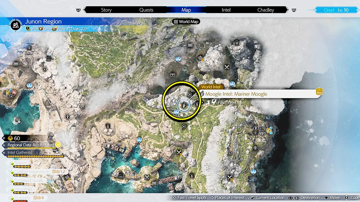 You will need to obtain the Junon Chocobo mount before you can access the Moogle Emporium in this region. That is because the Moogle Intel is located on top of a hill, and you need the Chocobo to walk up the wall that is below it. The Moogle Emporium is located in the middle of the map, north of the bay full of shipwrecks.