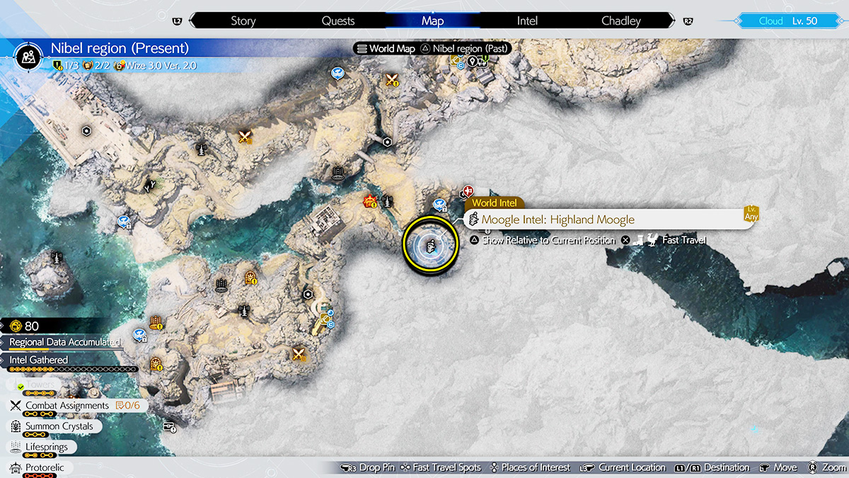 The last Moogle Emporium is located in the Nibel Region and can be found in the middle of the map. The easiest way to access this is to unlock the Chocobo Mount at the beginning of the chapter. You can then find the Moogle Intel south of the Activation Intel: Gull Bridge Tower. It’s also located on the other side of the mountain east of the Chocobo Sage manor, where Chadley is located.