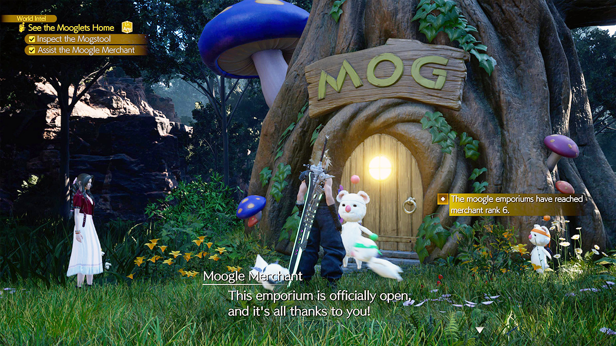 To unlock the Moogle Emporium as a store, Cloud has to complete the “Moogle Mischief” mini-game, where he has to round up a group of the missing creatures. However, the items sold in the Moogle Emporium change based on your “Merchant Rank.” So, as you progress the game’s campaign and complete the Emporium mini-game in each region, you will get access to more items.