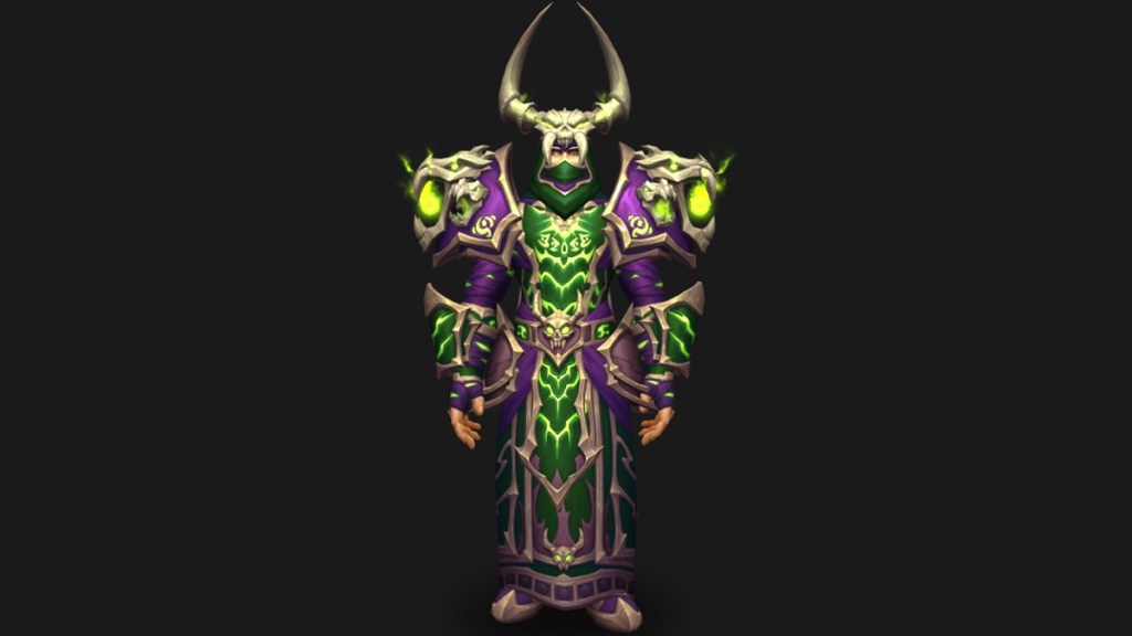 Rites of the Hexflame Covern is the Warlock tier set for Nerub-Ar Palace, which includes an animated eyeball on the helm and rising smoke effects on the shoulders. The LFR variant is yellow, Normal is blue, Heroic is purple, and Mythic is purple with golden accents and green visual effects. In addition, the Mythic variant occasionally summons six animated green hands behind the Warlock.