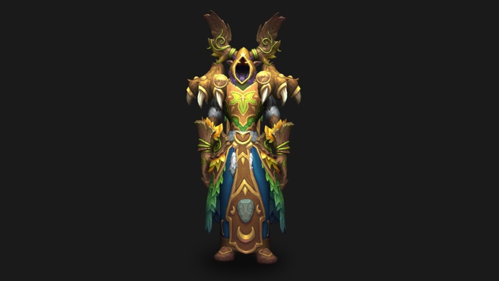 Mane of the Greatlynx is the Druid tier set for Nerub-Ar Palace and is lightly inspired by the lynxes of Hallowfall. The LFR variant is green and brown, Normal is blue, Heroic is orange and brown, and Mythic is dark brown with visual effects on the shoulders, gloves, and belt.