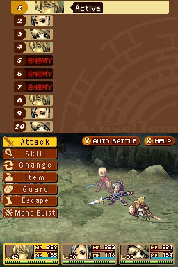 The real crux of Radiant Historia’s turn-based battle system, however, is the “Change” command. This allows you to change the order of turns, represented on the DS top screen, and decide who attacks when. The Change command applies to every single player present in the current battle — even enemies. You can swap your turns with theirs, too.