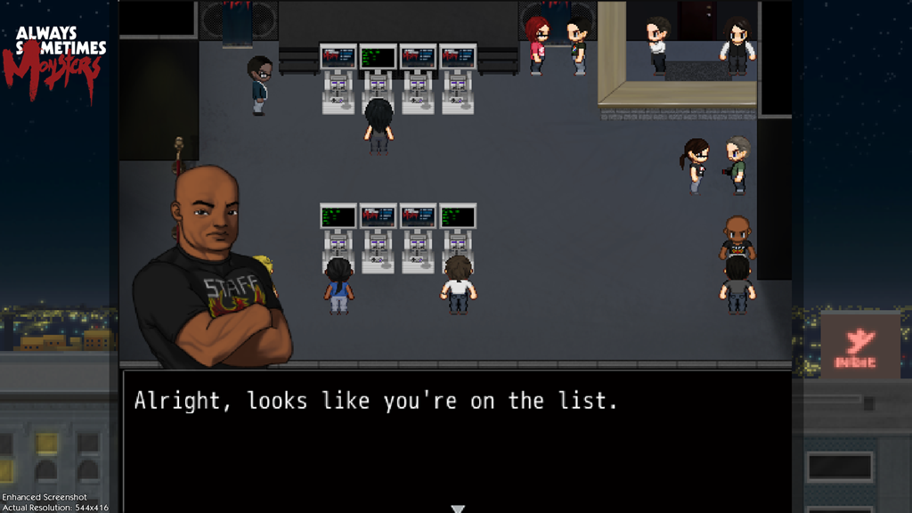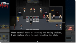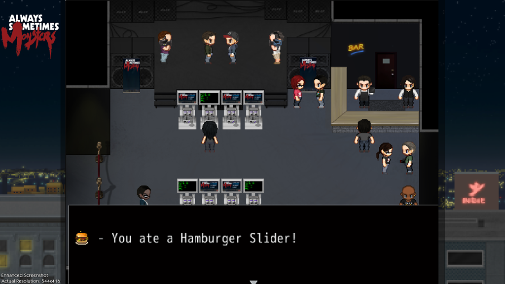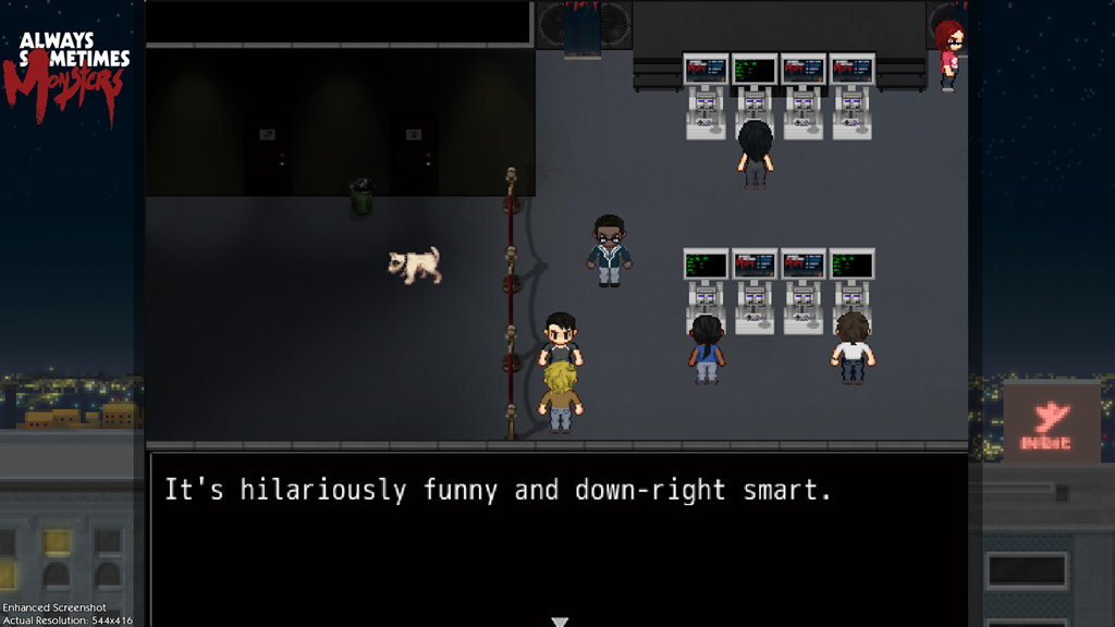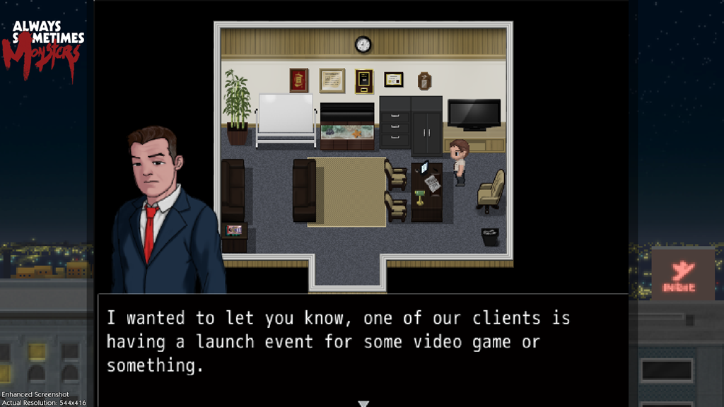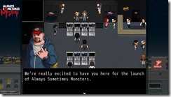 The demo will let Always Sometimes Monsters demo players be game journalists, going to a review event for Always Sometimes Monsters within the demo itself. You’ll be able to “interact” with in-game journalists and the in-game developers, and even write the in-game review. These quotes will then be shared amongst other demo players as a mixing of the real and virtual worlds.