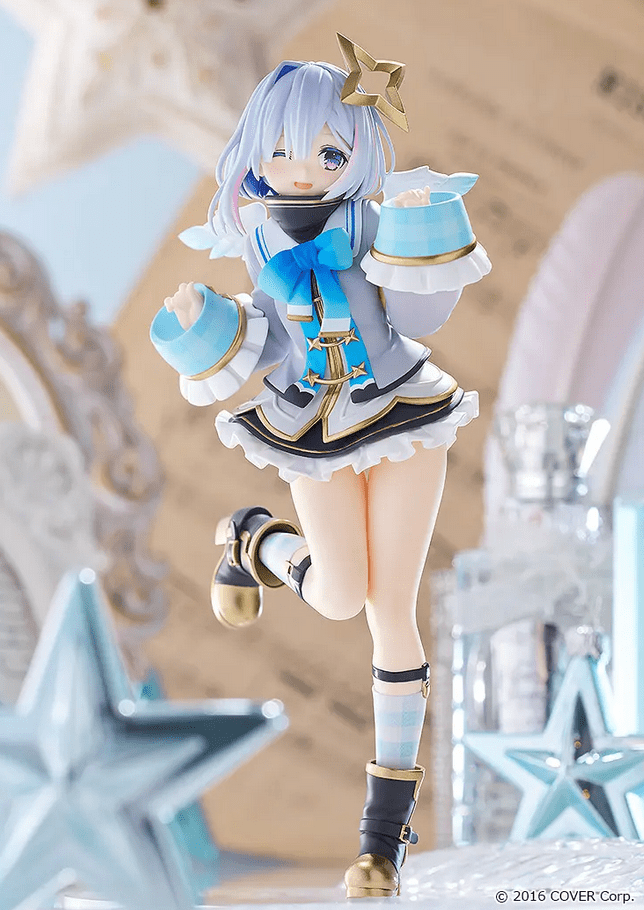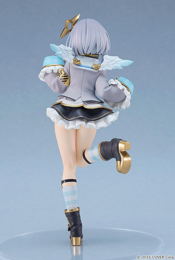 The Amane Kanata Pop Up Parade figure stands at approximately 170 millimeters, which is the norm for most figures in the collection. You cannot adjust her pose. She looks like she’s winking at you and either running in a rather girlish way, or striking a cute pose. One leg is up, and she’s holding both hands close to her face.
