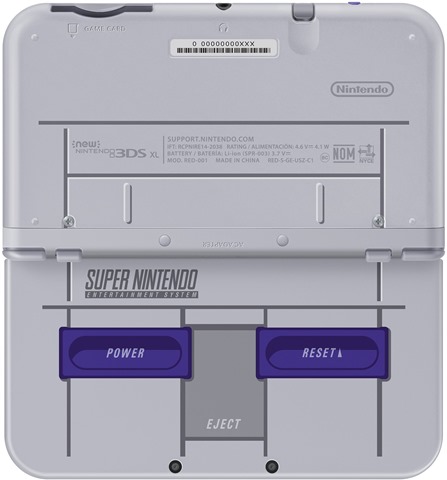 This $199.99 Super Nintendo-themed New Nintendo 3DS XL looks rather different than the versions released in Japan and Europe, due to the variation between the original systems. It has the fake purple Power and Reset systems on the front, as well as the grey Eject button. Inside, the action buttons are varying degrees of purple. It also comes bundled with a download code for the Super Mario Kart Virtual Console game.