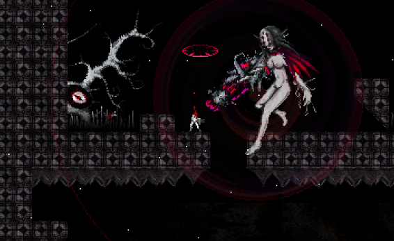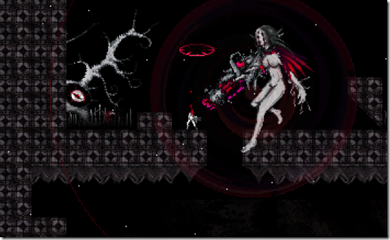 What I can tell you, then, is that Gyossait has you playing as a god named Oyeatia who heads into the darkest realms of Earth to find his lost love, the Goddess of Earth, Gyossait. The back story goes that Oyetia created mankind as a gift for his love but she ended up killing millions of humans in a cataclysm after they started to neglect the planet. This was enough to cause Oyetia to tear Gyossait apart and bury her deep inside the planet, out of the way. Now Oyetia feels regret and sacrifices immortality to enter the Gyossait’s prison to get her back. On the way, you’ll face destroyed humans devoured by Gyossait’s rage and pixel scenes depicting torture and torment. You can find more screenshots of Gyossait on its website, where you should also check back for more information about its upcoming Vita version.