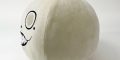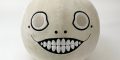 The Emil head plush is a circular cushion that looks like the character’s head in NieR Replicant and NieR: Automata. It is about a foot tall and appears to also be about that wide. Embroidery around his eyes and mouth outline his pupils and teeth.