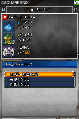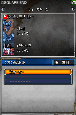 — you need to set up a battle. One player Nintendo DS acts as a host (Joker team, has a slime on top) and another searches for a challenger (Ryuta Team, has a lion on top).
