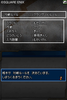 One a match is made, the host can choose a set of rules: standard, Square Enix, or custom. The custom rules allow you to tweak the number of rounds, monster tagging and so forth.