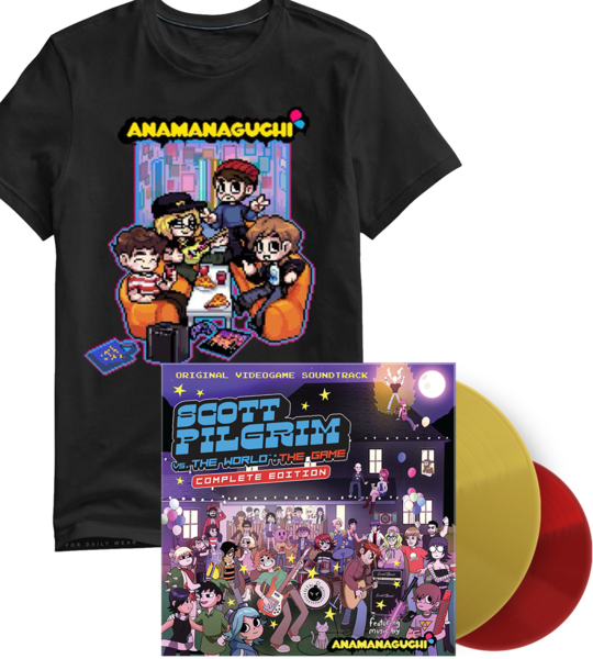 There are two options to choose from when ordering. One is to get the new vinyl release alone for $34.98. The other option includes an Anamanaguchi t-shirt in the Scott Pilgrim vs. the World: The Game drawn by Frisby. That’s $54.99.